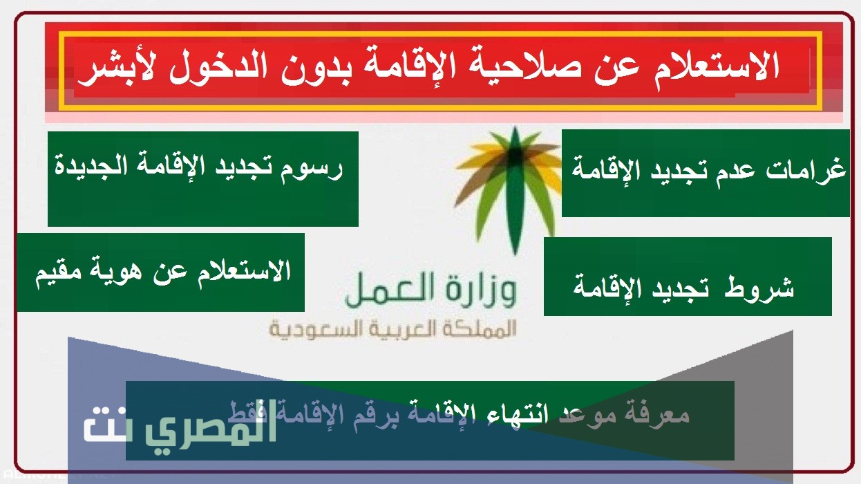استعلام عن تاريخ انتهاء الإقامة بدون الدخول لأبشر، تعتبر خدمة الاستعلام عن صلاحية الإقامة دون الضرورة لدخول أبشر من الخدمات المهمة التي يقدمها الموقع الالكتروني التابع لوزارة العمل داخل المملكة العربية السعودية، كما ويمكنك الدخول إلى الموقع والتمتع بمزيد من الخدمات الأخرى وأنت بمكانك مثل خدمة الاستعلام عن موظف وافد أو خدمة الاستعلام عن تسديد رسوم تجديد الإقامة.