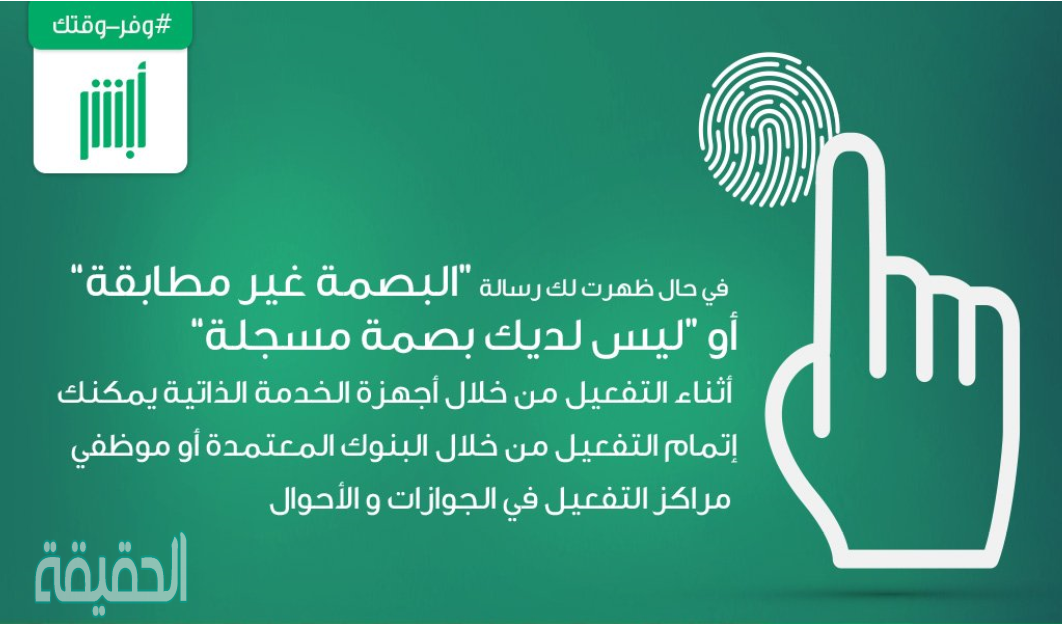 هناك حالات يتطلب علينا معرفتها أثناء التسجيل في نظام أبشر وفي حالة عدم قبول البصمة أو عدم مطابقتها يمكنك من خلال الطريقة التالية الاستفادة من الخدمة الذاتية من خلال بطاقة الصراف الآلي والتسجيل في أبشر والإستفادة من كافة الخدمات دون بصمة وهي الآلية التي تتم من خلال مصرف الراجحي أو البنوك المتاحة في السعودية والتي تدعم كافة الخدمات المتعلقة في جانب وزارة الداخلية ومن خلال الطريقة التالية يمكنك التسجيل في أبشر بدون بصمة.