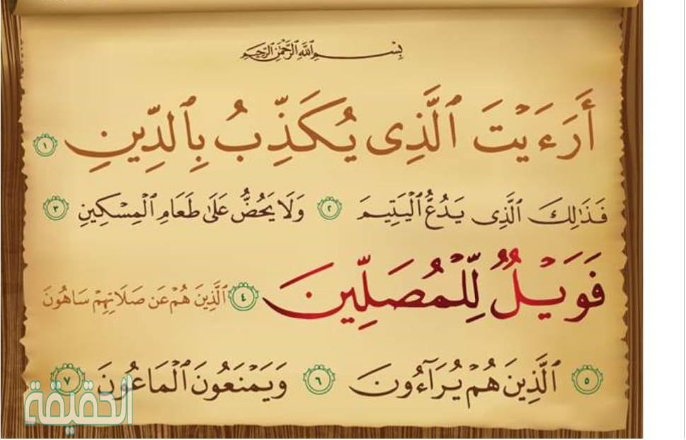 قال تعالى:” فَوَيْلٌ لِّلْمُصَلِّينَ – الَّذِينَ هُمْ عَن صَلَاتِهِمْ سَاهُونَ – الَّذِينَ هُمْ يُرَاؤُونَ – وَيَمْنَعُونَ الْمَاعُونَ” الآية القرآنية التالية المذكورة في كتاب الله على الظاهر الواضح والمبين فإنها تحمل معنى واضح وهو الويل وهو الإشارة بالعذاب الشديد من الله سبحانه وتعالى، حيث يتوعد الله المصلين الموصوفين بالصفات التي ذكرت ونصت عليها الآية القرآنية الكريمة حيث أن الله سبحانه وتعالى يحذرنا من العذاب في حال السهو والتغافل عن الصلاة فإن المراد ليس ترك الصلاة بل تحذير الكفار الذي يركون صلواتهم.