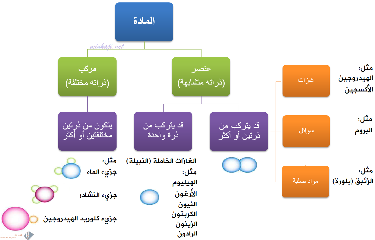 - العناصر، وهي أبسط أشكال المادة، ويعني ذلك أنه لا يمكن تقسيمها وتجزئتها إلى مكونات أصغر سواء فيزيائيا أو كيميائيا، وتتكون من نوع واحد من الذرات، وبذلك فان اي مادة تتكون من نوع واحد من الذرات هي العنصر، وقد تم وضع جميع العناصر المنفردة في الجدول الدوري، والذي قام بوضعه العالم مندليف، وعدد العناصر فيه لا تقل عن 118 عنصر، ومن الامثلة على هذه العناصر، الكربون والصوديوم والهيدروجين والحديد والاكسجين.
