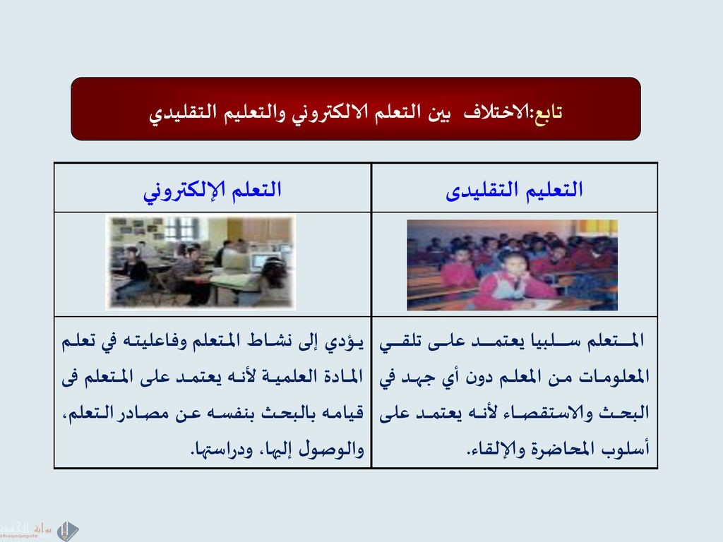 - ومن خلال التعليم الالكتروني يكون هناك تواصل بين الطالب والمعلم ولكن دون تحديد موعد أو مكان.