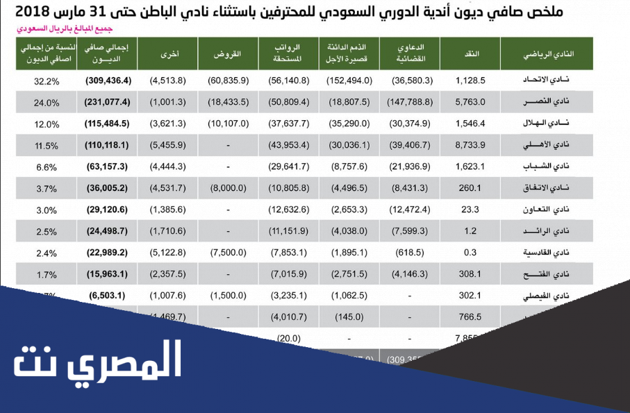 ديون الأندية السعودية تم الإعلان من قبل اللجنة المسؤولة عن الكفاءة المالية في الرياض عن تفاصيل الازمات المالية الموجودة في الأندية وخصوصاً في نادي دوري الأمير محمد المتخصص للمحترفين السعودي، الذي حصل على المركز الأول من حيث الديون حيث بلغت ديون النادي 298,844,192ريال سعودي، يجب سداد الديون حتى تاريخ 26 يناير لعام 2025 اذا لم تقوم الأندية بتسديد الديون سيتم حرمانها من شهاده الكفاءة المالية.
