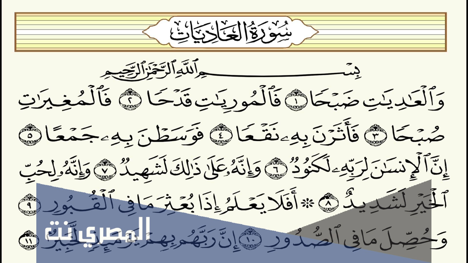 - كما أن رؤية سورة العاديات في المنام تدل على أنك ستتخلص من الأشخاص الذين يجلبون لك الكراهية والعزة والحقد والعداوة.