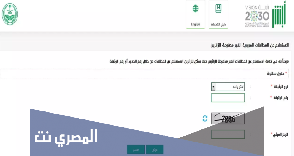 - ثم يتم إدخال رقم التعريف الخاص بك ، ثم يتم إدخال الرمز الخاص بك ، وهو رمز خاص بكل شخص ومختلف عن الآخرين ، ثم يتم الضغط على كلمة “عرض” ، ثم يتم عرض جميع الانتهاكات الخاصة بك.