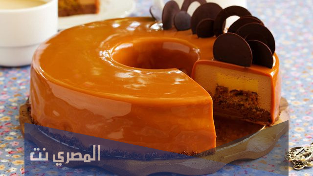 - يُسكب المزيج فوق طبقة الكراميل في القالب ويُوزّع أيضًا على جميع الجوانب.