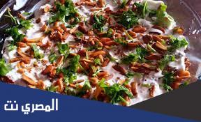 - ثم نضيف الباذنجان على الوجه ، ثم نضيف نصف كمية صلصة اللبن مع الطحينة.