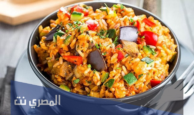 - نحضر وعاء عميق ونضع الخضار المشوية في الفرن ، ثم نضع الأرز فوق الخضار.