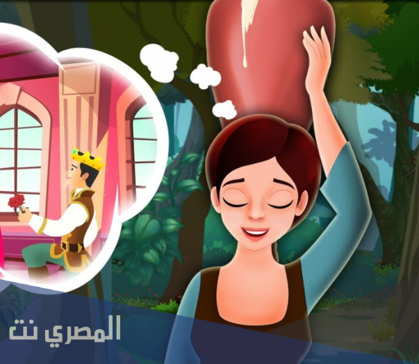ظلت تفكر في أنها ستشتري الدجاج بالمال ، ويضع الدجاج بيضًا ، ويفقس البيض دجاجًا صغيرًا ويزيد عدد الدجاج ، وتشتري عربة وتضع فيها دجاجًا وبيضًا وحليبًا وتبيعها في ستصبح سيدة غنية جدًا ، وبينما كانت تحلم ، سقط إبريق الحليب من رأسها ودمر الوعاء تمامًا وانسكب الحليب على الأرض وجلست الفتاة تبكي ، وذهبت أحلامها كلها. لن أذهب إلى القرية ليس لدي حليب ولن أذهب إلى الحفلة أيضًا والفتاة تسمع صوتًا واحدًا صوت الجدة لا تبني قصرًا في الهواء ..