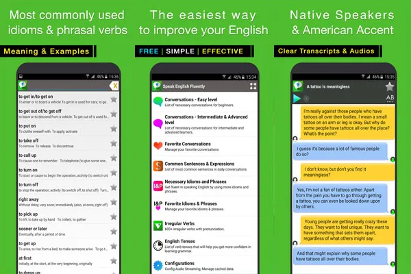 إذا كنت تبحث عن تطبيق يقوم بتطوير اللغة الإنجليزية وطريقة تحدثك واستماعك للغة الإنجليزية ويساعدك على التحدث بها بسلاسة ، فهذا التطبيق مناسب لك تمامًا ، حيث أن جميع الملفات الصوتية داخل التطبيق هي باللهجة الأمريكية ، ويحتوي تطبيق Speak English Fluently على قائمة بمعظم الكلمات والعبارات التي يتم استخدامها في المحادثات اليومية ، سيساعدك التطبيق على تحدث الإنجليزية واللكنة الأمريكية بطلاقة. يضيف التطبيق ويحدّث دروسًا ومميزات جديدة أسبوعياً.