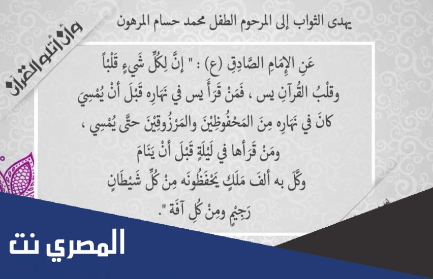 - عن أنس قال رسول الله صلى الله عليه وسلم: “لكل شيء قلب ، وقلب القرآن ياسين.